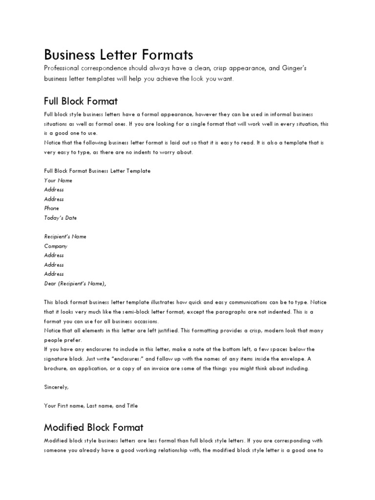 Modified Block Format See Sample 2 In a modified block business letter the heading complimentary close the signature and identification are aligned to the right. The samples below will help you determine which style you prefer. Full Block Form Your Name Address Phone Number E-mail optional Date Name of Receiver Title Company Name Address Dear _____.