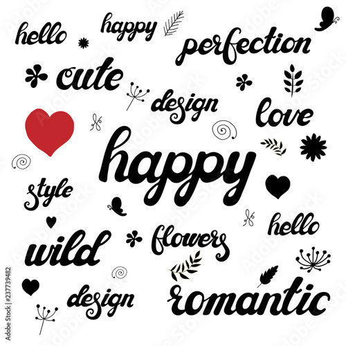 Handwritten Lettering Set Modern Brush Calligraphy With Floral Doodles For Photo Overlays Cards T Shirt Print Posters Hello Happy Flower Romantic Love Perfection Wild Design Style Cute Stock Vector Adobe Stock