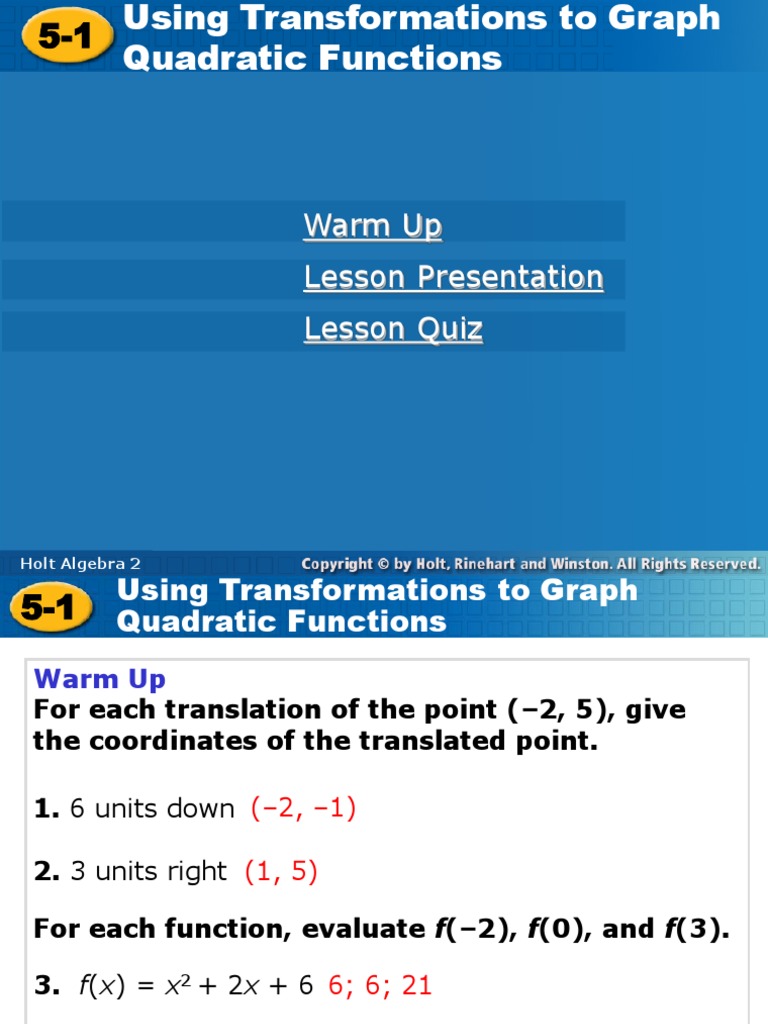 Holt Mcdougal Algebra Using Transformations To Graph Quadratic Functions Warm Up For Each Translation Of The Point 2 5 Give The Coordinates Ppt Download